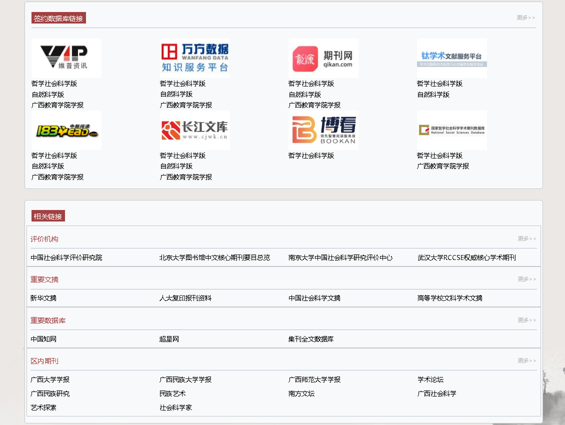 此番网页设计在原版基础上有较大改进,主要表现在:(1)将页面背景色改为古香古色的卷轴色,配以墨竹、荷花、扁舟、渔翁、山水等国画元素,增添网页的文化品位;(2)在页面布局上改栏目横向并列为竖向分列,使得“动态消息”“通知公告”两个核心栏目题名得以完全展现;(3)补充了与学报签约的八个数据库的详细链接,便于读者查阅和实现数据引流;(4)重新布局了“相关链接”板块,分为“评价机构”“重要文摘”“重要数据库”“区内期刊”四个专栏进行展示,有利于随时了解掌握与学报密切相关的核心要素动态,特别是区内核心期刊的办刊动态;(5)充分考虑了当今时代手机阅读的趋势,在设计上实现了电脑端与手机端页面的融合。