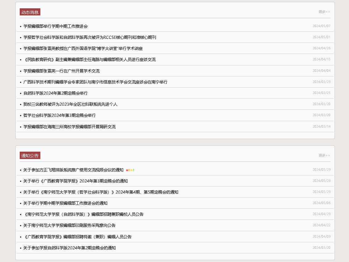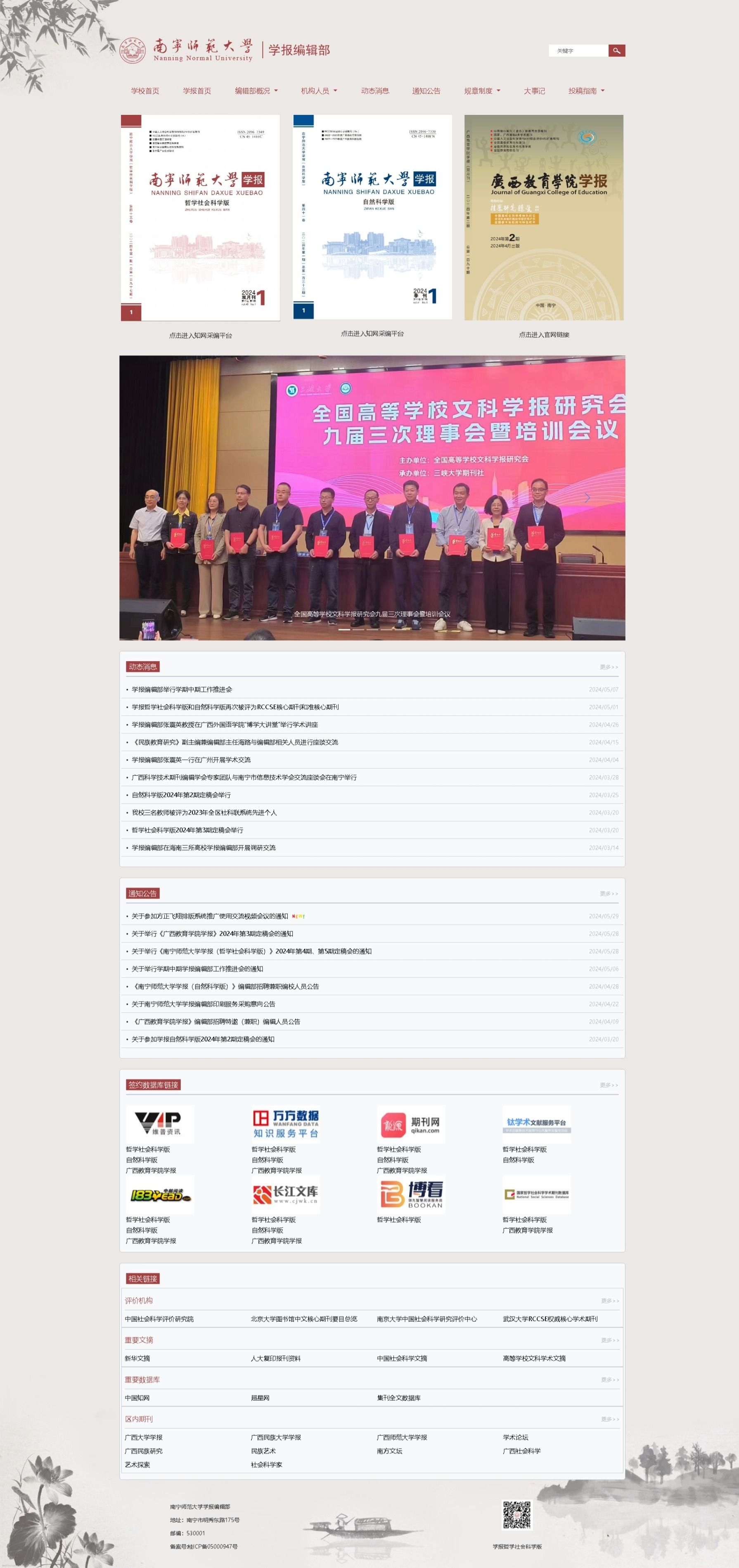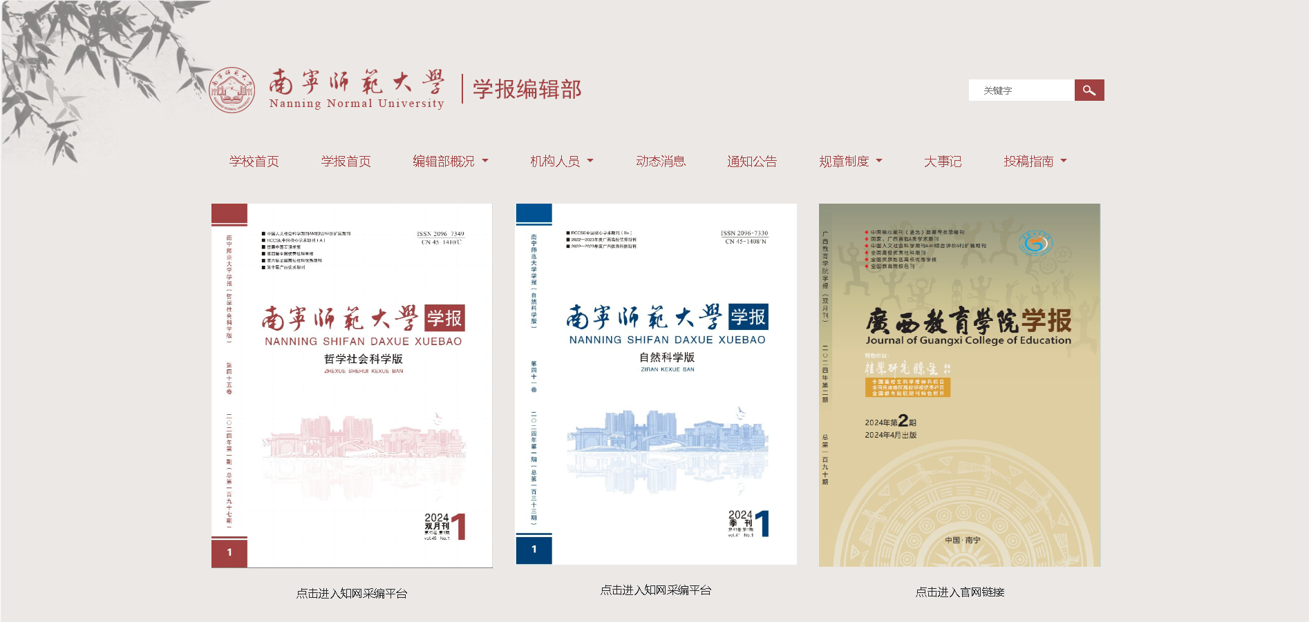 修订版网站继承了原网站的基本设计方案,整合了学报编辑部负责编辑出版的《betway必威西汉姆联官网学报(哲学社会科学版)》《betway必威西汉姆联官网(自然科学版)》《广西教育学院学报》三种学报资源,设有“编辑部概况”“机构人员”“动态消息”“通知公告”“规章制度”“大事记”“投稿指南”“相关链接”等栏目,每个一级栏目下复设若干相关的二级栏目。
