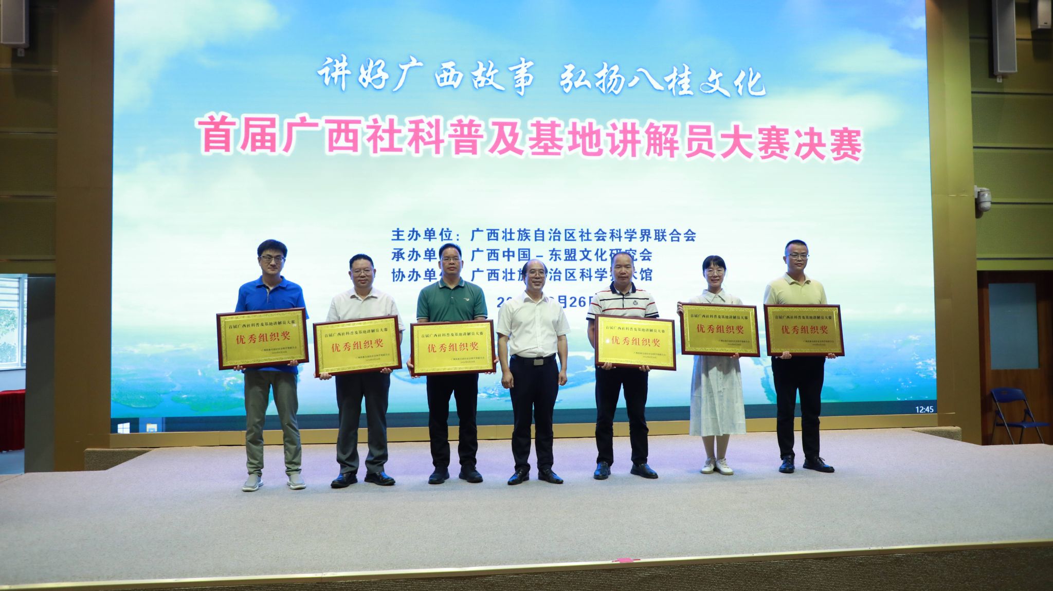 由自治区社科联主办、广西中国-东盟文化研究会承办、自治区科学技术馆协办的“首届广西社科普及基地讲解员大赛决赛”于2024年8月26日(周一)上午8:30-12:30在广西科技馆三楼学术报告厅举行。大赛设初赛、评审、决赛等阶段,自5月启动以来,得到了广西各市、各高校社科联、各有关社会组织和基层社科普及基地的高度重视和积极响应。自治区社科联党组成员、副主席钟文干发表讲话,自治区党校陈学璞教授代表评委做学术点评,学报编辑部主任张震英教授应邀与陈学璞教授共同担任大赛总评委,参与了视频评审、自主命题和决赛评审的全过程。来自区内各社科普及基地选送的28位经初赛脱颖而出的选手参加决赛,决赛分自主命题讲解和随即命题讲解两个环节进行。经过4个多小时的激烈角逐,最终北海市博物馆蔡柠等5位讲解员荣获一等奖,柳州市柳侯祠程赵群康等10位讲解员荣获二等奖,钦州市灵山县大芦村梁艳萍等13人荣获三等奖。最后,自治区社科联党组成员、副主席钟文干,自治区社科联科普部主任杨辉和大赛评委一道为获奖选手颁奖。