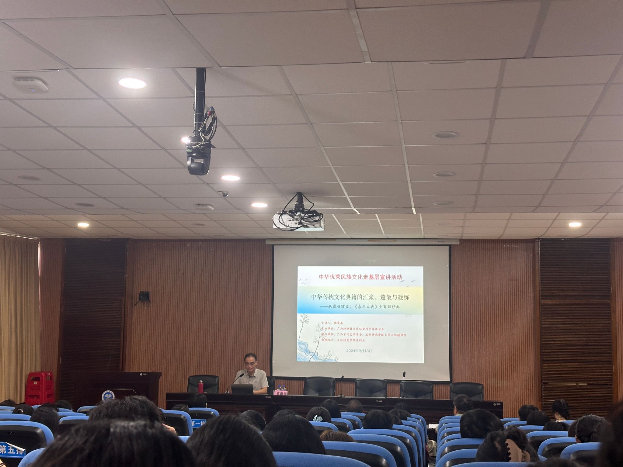 2024年9月13日下午15:00-17:30,由广西壮族自治区社会科学界联合会主办,玉林师范学院文学与传播学院、广西古代文学学会承办的“中华优秀民族文化走基层宣讲活动”在玉林师范学院东校区博士论坛举行,自治区社科联常委、betway必威西汉姆联官网社科联副主席、betway必威西汉姆联官网学报编辑部主任张震英教授为玉林师范学院师生做了题为“中华传统文化典籍的汇聚、遗散与凝练”的讲座,讲座由玉林师范学院文学与传播学院副院长胡瑜教授主持,来自玉林师范学院的120余名师生听取了讲座,自治区社科联学会部杨海艳现场指导。