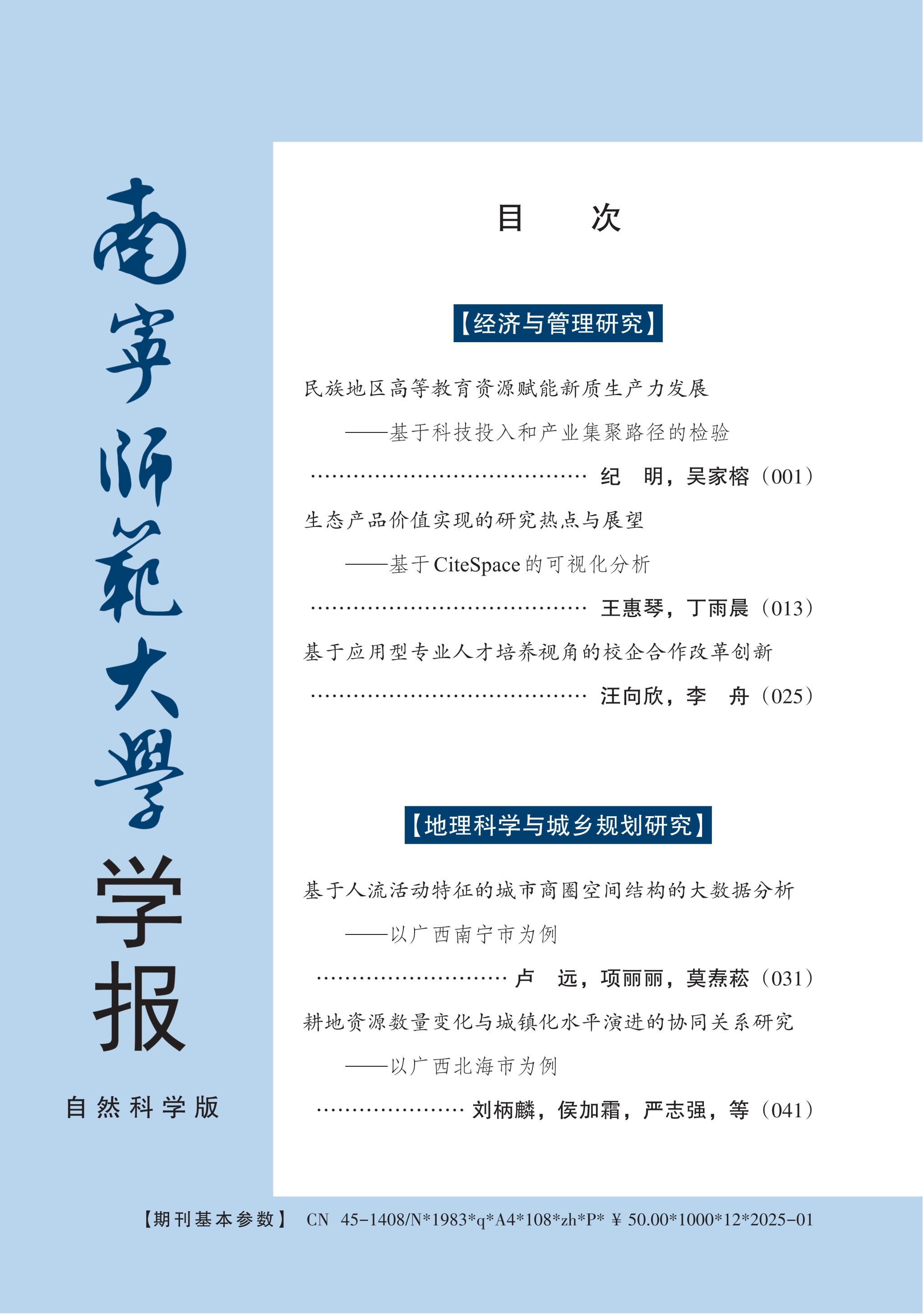 自2025年第1期起,为了抢占先机,提升阅读、下载、转引数据,自然科学版在对刊文数量进行适当缩减的同时,对出刊时间也进行了调整,由3、6、9、12月25号改为1、4、7、10月1号出刊。同时以学校二级学院为基础,根据栏目设置专业化、专题化、精细化的趋势及服务学校学科建设的需要,对原有栏目进行了全新改版,设有“数学、物理、化学基础科学研究”“地理科学与城乡规划研究”“环境与生命科学研究”“自然资源与测绘研究”“计算机、大数据与信息工程研究”“经济与管理研究”“物流管理与工程研究”“旅游与文化研究”“音乐、美术、体育论坛”“基础教育、职业教育、民办教育论坛”“财政、金融与审计论坛”“教育教学理论与实践”等栏目,每期论文根据专题策划和约稿来稿情况灵活推出,又将经济、管理、审计、财政、旅游、音美体、自然科学教学教改等专业领域纳入自然科学版范围,扩大了自然科学版的学科容量,便于更好地为学校学科建设服务。