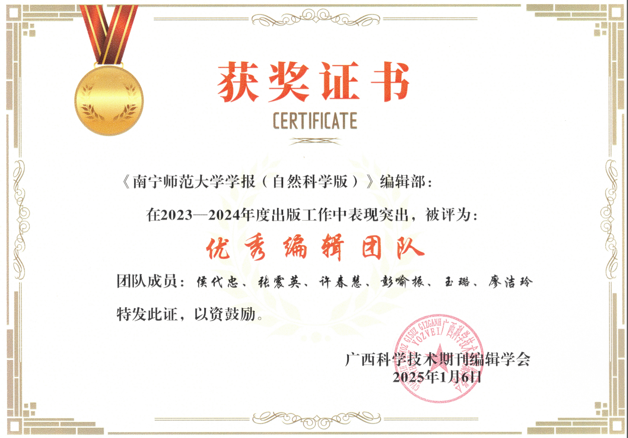 2025年1月13日(周一),“2024年广西科学技术期刊编辑学会年会”在广西陆川县举行,来自全区科学技术期刊界40余家单位代表及湖南省新文科文献计量科学研究院有限公司代表共70余人与会。会议分为开幕式、颁奖、工作总结、学术交流、理事会议等环节,学报编辑部主任张震英、自然科学版执行副主编许春慧参会。会议公布了“2023-2024年广西科学技术期刊优秀编辑团队”获奖名单,《betway必威西汉姆联官网(自然科学版)》编辑部被评为“2023-2024年度优秀编辑团队”,张震英代表编辑部领奖。在学术交流环节,教育部长江学者特聘教授、南京大学苏新宁教授做了《谈期刊学术影响力提升——从主编角度》的主题报告。在理事会议环节,第七届理事会讨论通过了第八届理事会候选人名单、团体会费标准并布置了换届相关工作。