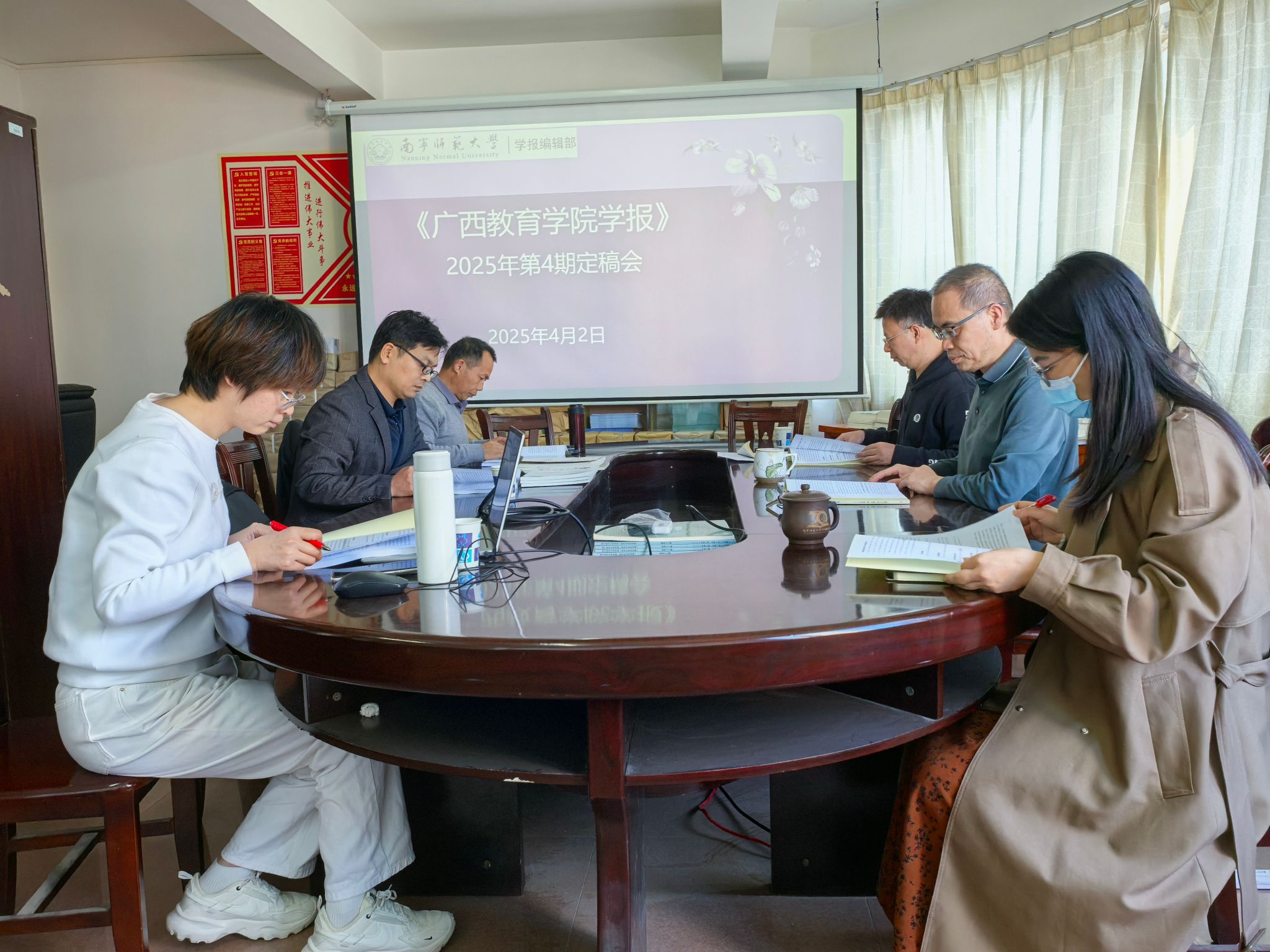 2025年4月2日(周三)下午15:30-18:00,《广西教育学院学报》2025年第4期定稿会(编前会)在明秀校区行政楼716学报编辑部资料室举行,编辑部主任、《广西教育学院学报》执行主编张震英教授主持会议,学报编辑部副主任、《广西教育学院学报》执行副主编覃凌波、《广西教育学院学报》执行副主编翟香丽、实习编辑赵明参会,科研管理处副处长、《高教论坛》副主编任初明教授,职业技术师范学院逯长春博士作为特邀专家参会。