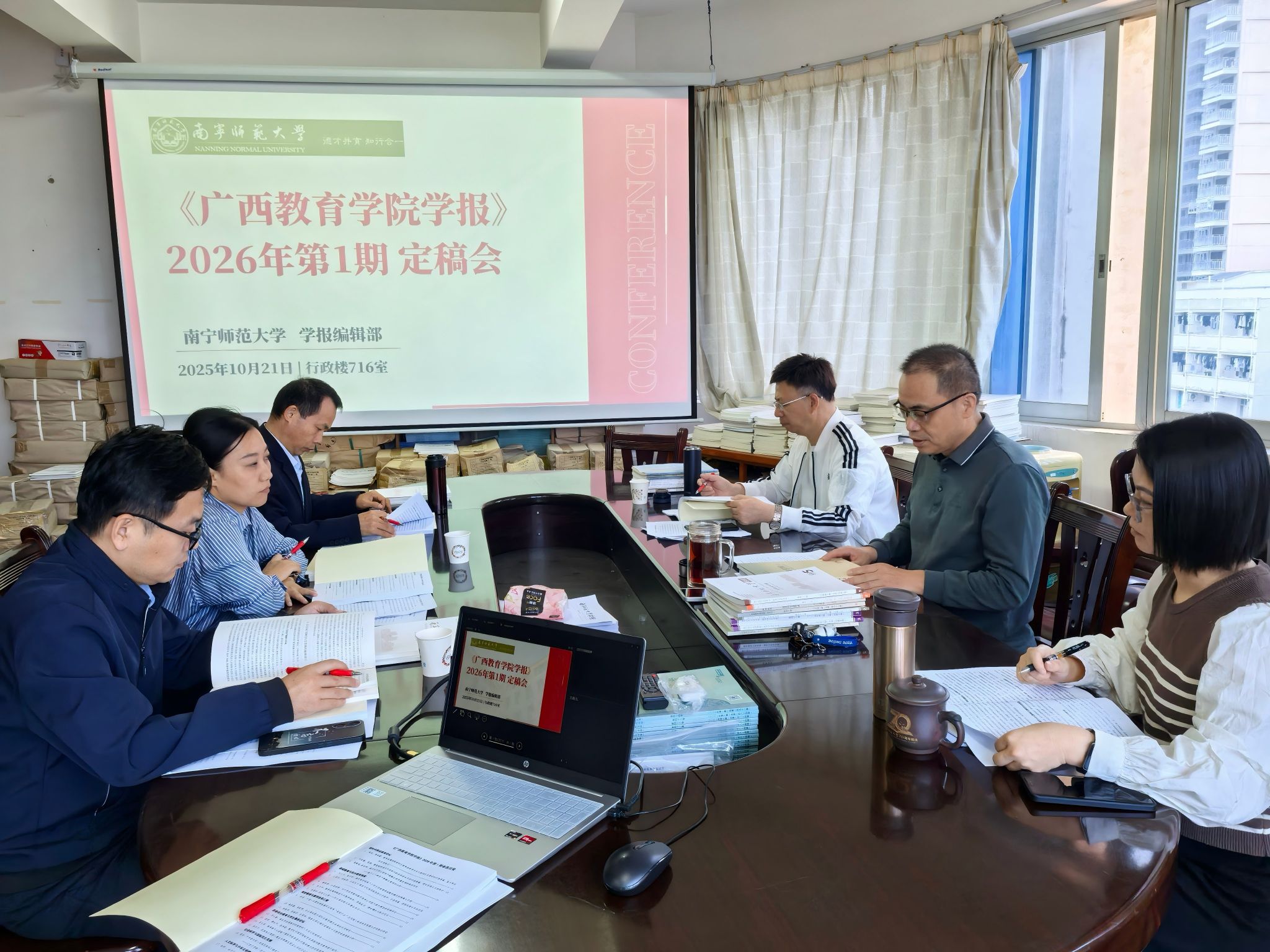 10月21日(周二)上午9:00-12:40,《广西教育学院学报》2026年第1期定稿会(编前会)在明秀校区行政楼716资料室举行,编辑部主任、《广西教育学院学报》执行主编张震英教授主持会议,学报编辑部副主任、《广西教育学院学报》执行副主编覃凌波、《广西教育学院学报》执行副主编翟香丽、实习编辑赵明参会,发展规划处副处长、《高教论坛》副主编任初明教授、职业技术师范学院逯长春副教授、国际教育学院汉语教研室主任张寒冰副教授作为特邀专家参会。