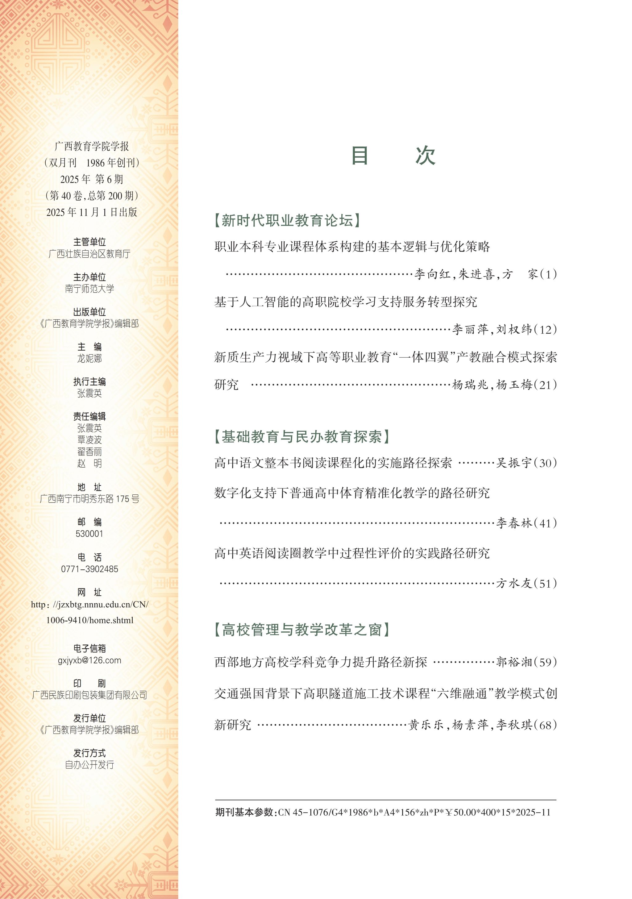 《广西教育学院学报》为双月刊,2025年第1、2、3、4、5期已如期出版发行及上传中国知网等合作数据库。2025年第6期已完成编校,待完成外校、审核、签批后定于11月1日正式出刊。2026年第1期定于1月1日正式出版,重点论文提前15天网络优先发表,敬请荐稿赐稿、关注支持。