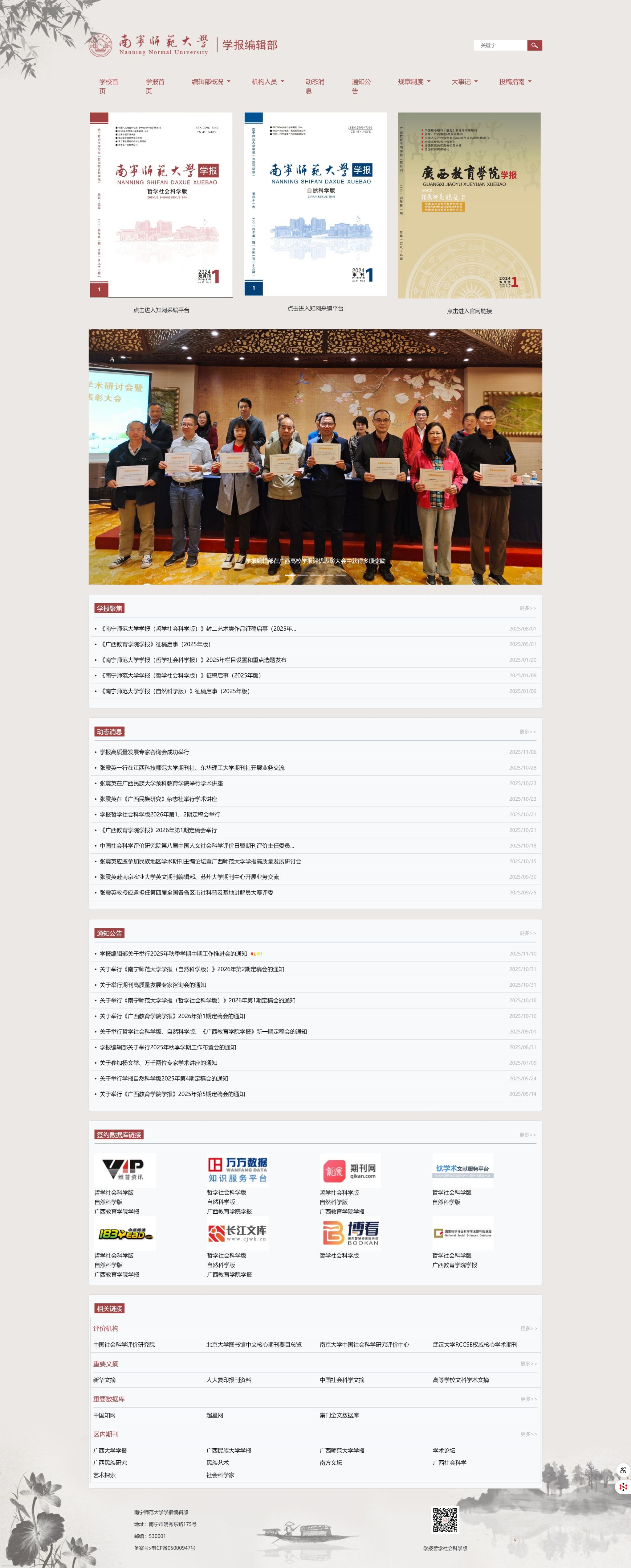 讨论并布置青年编委会组建事宜;督促在12月15日、1月15日前完成哲学社会科学版、《广西教育学院学报》2026年第1、2期编校工作;编委会成员证书发放;学期末与兄弟单位开展业务交流事宜;布置2025年度哲学社会科学版优秀论文评选工作;2026版征稿启事修订完善;哲学社会科学版、自然科学版封二“南师学人”栏目人选确定;讨论确定与维普网合作提升期刊影响力事宜;哲学社会科学版2026年重点选题;督促2026年春季学期学术研讨会筹备事宜;讨论确定自然科学版补充人员事宜;布置自然科学版变更为双月刊可行性论证报告撰写;确定三刊内容调整后2026年具体页码;《广西教育学院学报》栏目更改及调整事宜;《广西教育学院学报》经费来源变更可行性讨论;讨论各刊校内外发文大致比例;哲学社会科学版装帧设计提升相关举措;其他需要讨论决定的事宜。